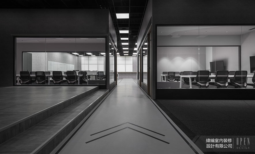 本案為醫療電子企業辦公空間,緯綸室內裝修設計有限公司 以極簡美學為核心,透過深邃炭黑天花板與結構框架的沉穩基調,營造專注內斂的工作氛圍;大面積玻璃隔間創造通透視覺界面,搭配灰階地坪的素淨紋理,有效平衡深色調帶來的厚重感受;中央廊道採線性導引與對稱佈局強化動線秩序,配合上方的線性燈光營塑未來科技感,並結合開放與私密區域的靈活配置,為工作者打造一處兼具效率、秩序與精緻美學的專業辦公場域,充分體現設計師對於空間的敏銳掌控與深厚藝術修養。