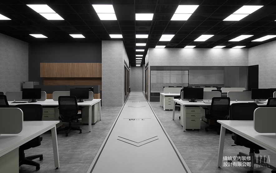 從入口品牌標識到核心辦公場域,皆展現出 緯綸室內裝修設計有限公司 對空間比例、質感搭配與環境氛圍的細膩把控。深黑天花板與灰白地坪構成的色階對比,佐搭線性燈光系統的有序分布,不僅延展空間縱深視覺,更與通透玻璃界面達到輕重平衡,將深色調的濃重特質轉化為內斂沉穩的專業質感。結合直覺動線引導、靈活多樣的空間配置,成功打造融合美學品味與實用機能的現代辦公環境,深度詮釋企業追求卓越、格調與執行力的品牌精神。
