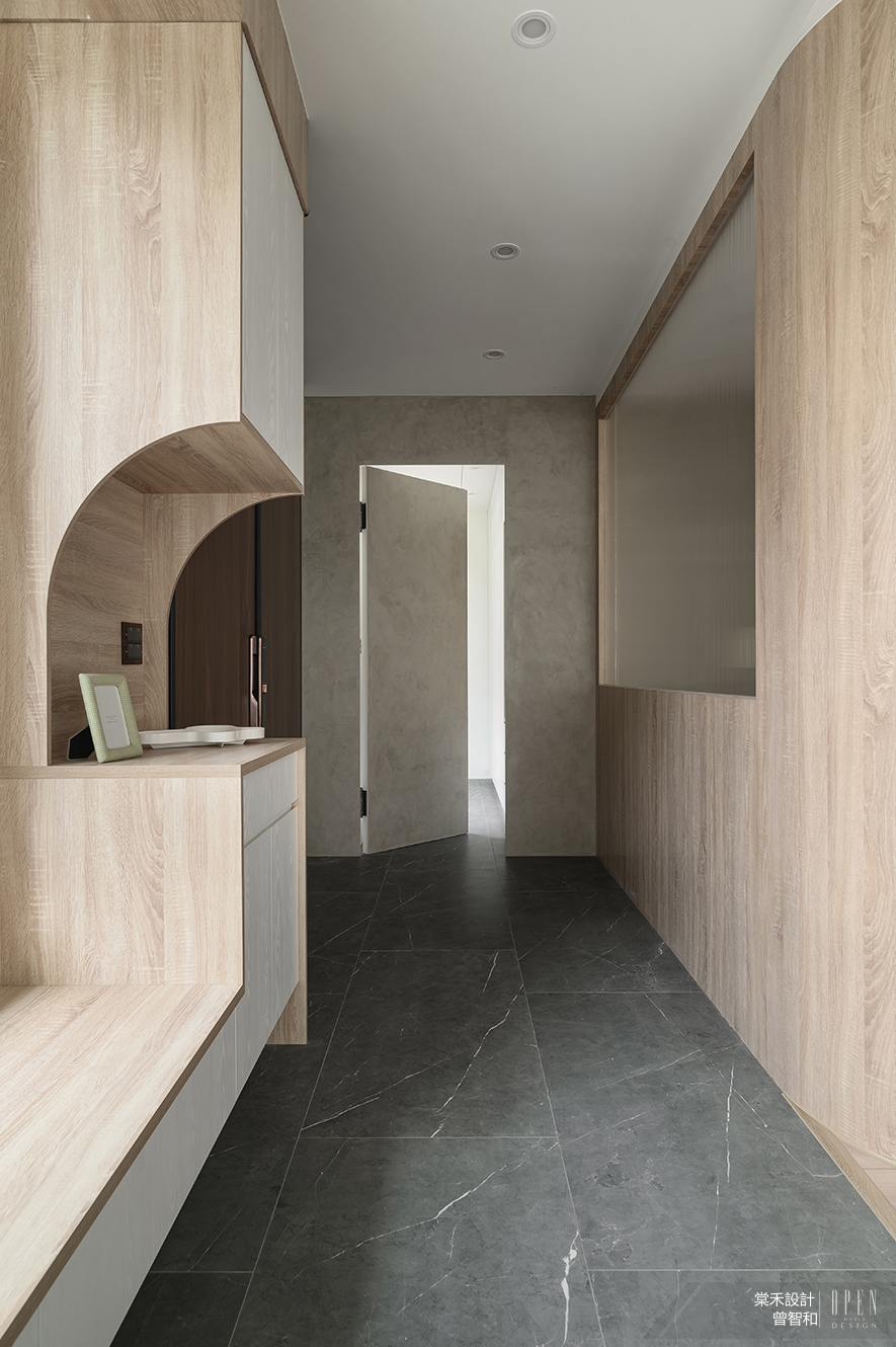 踏入門扉,曲面木作隔屏如月牙般優雅延展,巧妙勾勒出內外之界。窗櫺引入的日光灑落墨玉般的石紋地坪上,形成光律交織的迎賓序曲。弧形木作包樑與玄關櫃採用相同淺木質調,從立面延伸至頂塑造連續包覆感,消解原有建築結構的剛硬轉角,猶如安穩的臂彎,靜候歸人卸下風塵;在這初得安穩的懷抱中,旁側隔間牆轉角的弧形導引柔化空間的轉折,更進一步引領從外界喧囂至完全沉澱內心寧靜的步履,在這光線遞變的過渡之境,心緒隨著曲線的韻律,緩緩沉澱,回歸家的懷抱。