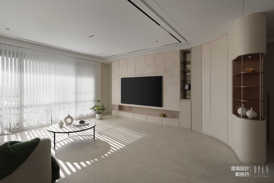本案為四口之家的溫馨居所,澄境設計 設計總監 鄭抿丹 以圓弧作為空間主軸,在入門處巧妙勾勒櫃體的轉折,讓玄關與客廳之間的過渡更為流暢,形成和諧的韻律感。曲線不僅柔化長形格局的剛硬線條,更將電視牆與櫃面邊緣串聯,讓空間在素淨的淺色基調中,呈現出輕盈而詩意的生活氛圍。此外,為實現屋主對安全無毒空間的期待,設計團隊特別選用無甲醛建材與礦物塗料,從源頭把關空氣品質,創造舒適的綠色居住環境,以細膩的關懷守護全家人的生活品質與健康。