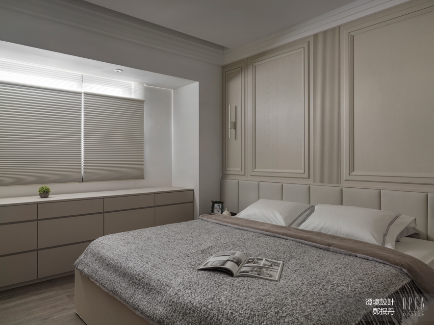 主臥延續公領域的米色及線板造型,營造純粹而寧靜的休憩氛圍。窗畔平臺整合抽屜櫃與梳妝區,櫃內預留插座的貼心規劃,使吹風機、電捲棒等電器隨時供居者方便取用,令每個清晨與夜晚的梳理,都變得從容而優雅;後方的更衣間則與浴室相連,形成流暢便利的生活動線,讓此處成為美好睡眠與悠閒晨昏而設計的私密天地。
