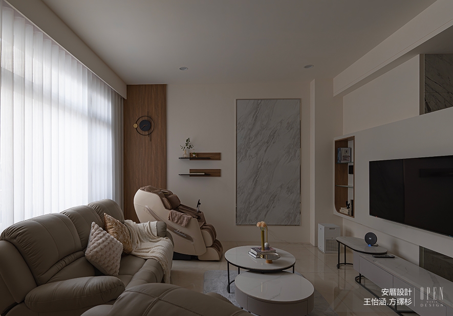 大面積的象牙白與淺駝色在此舒柔交匯,圓潤飽滿L型沙發如雲朵輕盈佔據視覺焦點,編織抱枕、毛絨織品層疊其上,為純淨基調注入溫暖觸感;前方淺色圓形造型茶几、弧形電視櫃,結合黑色鐵件框架,在懸空皓白的電視牆下帶出視覺重心,達成色彩的和諧,醞釀一室柔軟安定;一旁,大面石紋磁吸板的細膩灰白紋理,宛如行雲流水一般悠然延展,將典雅氣韻凝結於牆面,同旁側木質懸浮層板、立面構成異材質的優雅對話,在造型壁燈的光澤映照下,譜寫當代簡約與生活溫度兼容的溫馨居家時光。