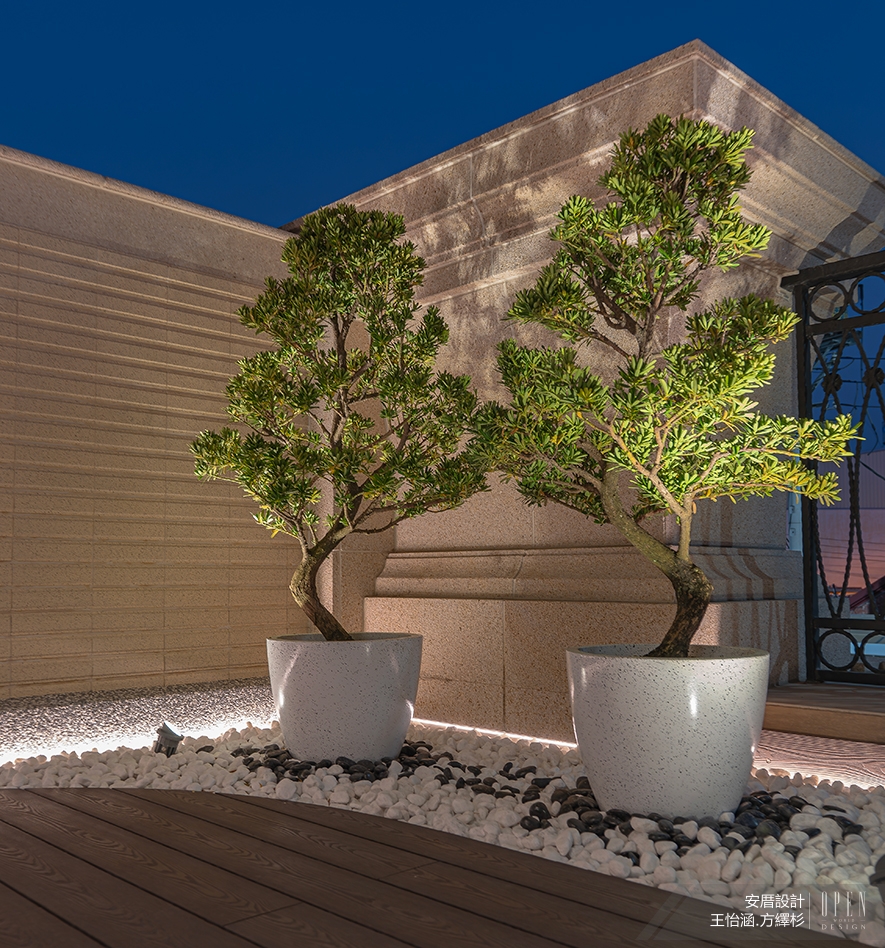 夜幕低垂,二樓露臺在深藍夜空的映襯下,展現另一番禪意景致,設計團隊與屋主攜手,以木質地板鋪陳和煦基底,黑白雙色卵石交錯鋪設,配合周圍嵌入的間接照明,其光暈溫柔勾勒石材、木紋的細膩質地。卵石之上,兩顆綠植挺立於潔白陶盆,蒼勁枝幹與翠綠針葉在夜色中依然盎然生機,透過精心配置的地燈投射,將植栽的優雅身姿映射於牆面,構成一幅流動的光影畫作,在有限中創造無限的閒適氣氛,成為一家人在忙碌中得以放鬆身心、親近自然的秘密花園。