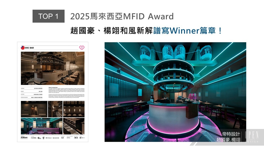 MFID作為馬來西亞首個且唯一的國際設計獎項,在「創新、永續發展與文化交融」的指引下,開啟設計產業的無限可能。帝特設計趙國豪、楊翊總監運用智能燈光系統,晝夜變換截然不同的場景風情,在和風、賽博迥異語彙間自在遊走,為賓客開展一場感官盛宴的酒吧新作《DDC酒吧》,於商業空間類中獲「Winner」肯定,閃耀國際舞台!