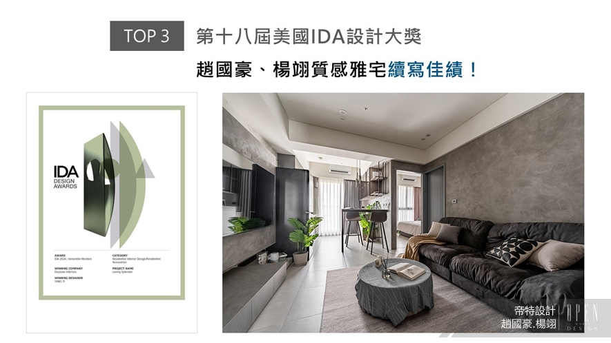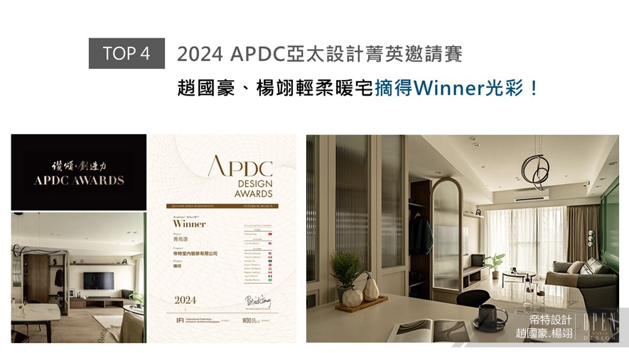APDC亞太設計中心是室內設計聯合國組織IFI的全球成員,而由該組織發起的APDC AWARDS,是亞太地區最重要的獎項之一。帝特設計趙國豪、楊翊總監巧運溫潤和緩的大地色系,搭配曲弧流線及線板造型,描繪柔順輕盈的溫馨畫面,為深愛出國旅遊的業主二人,構築飽盈異國風韻的愜情屋邸《青苑遊》,於2024 APDC AWARDS中攫獲眾人目光,順利抱回「Winner」榮譽!