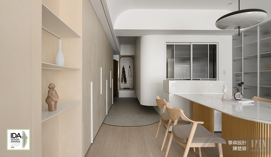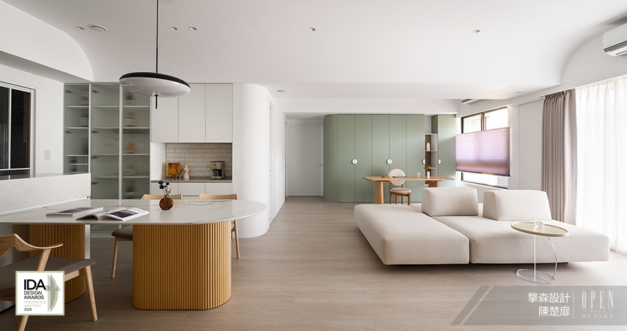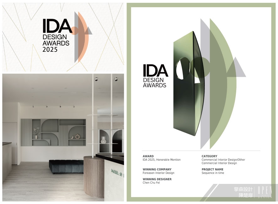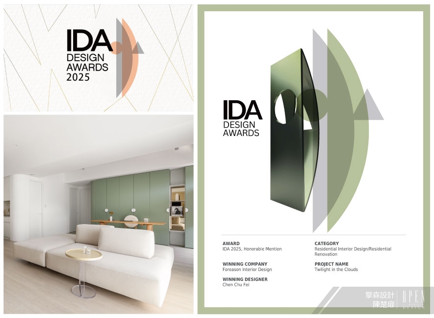 美國IDA國際設計大獎自創新性、實用性和發展性等多種面向為評選標準,旨在發掘、表彰「設立新標準」與「突破室內設計界限」、「改變人們生活和工作空間」的優秀設計師及團隊。此次2025年度賽事,擎森設計 設計總監 陳楚扉 以攝影工作室《時序》及家宅《雲暮》參賽。前者透過於全室灌注大地色系,讓自然界的沉穩樸實,擁抱前來拍照的家庭顧客和新生兒;後者亦同樣運用米、棕暖調和低彩度淺綠,襯托立面及天壁的雲白,成就如瀏覽山林雲海般的愜心景緻。兩件作品皆以提供使用者舒適空間的理念,體現大賽宗旨內「藉設計改變人們的生活與工作」之核心標準,雙雙抱回「Honorable Mention」的優良佳績!