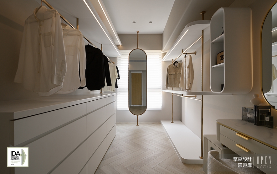 ▲主臥弧形木作床背板內藏暖黃間接光源,可作夜燈並營造舒眠氛圍;更衣室整合衣架、抽屜櫃與梳妝臺,並以伸展臺為概念發想窗畔淺金鏡面,提供住者一展美學的時髦舞臺。