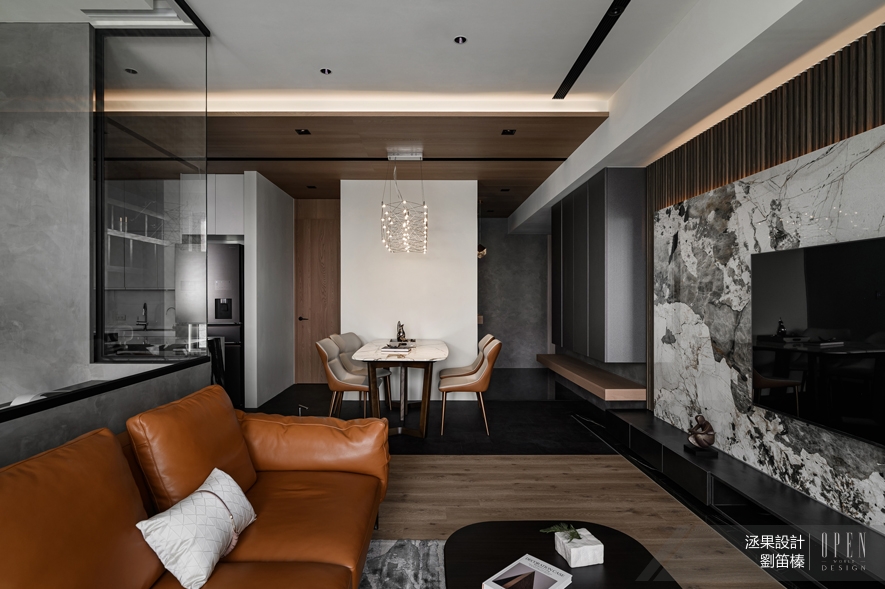 ▲公領域以白灰大板磚和灰泥塗料打造簡潔時髦基調,搭配深木色格柵、地坪及橘褐軟裝,營造溫潤放鬆感,佐以間接照明平衡現代與自然的氛圍,精美吊燈與壁燈增添視覺層次,塑造獨特混搭風格。