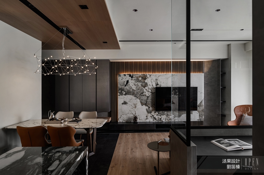 ▲餐廳選用石紋圓角餐桌搭配橘白雙色皮椅,與灰色板岩地坪、實木皮天花板相映成趣,洗鍊優美的幾何造型吊燈懸掛其上,增添藝術感,營造溫馨時尚的用餐氛圍。