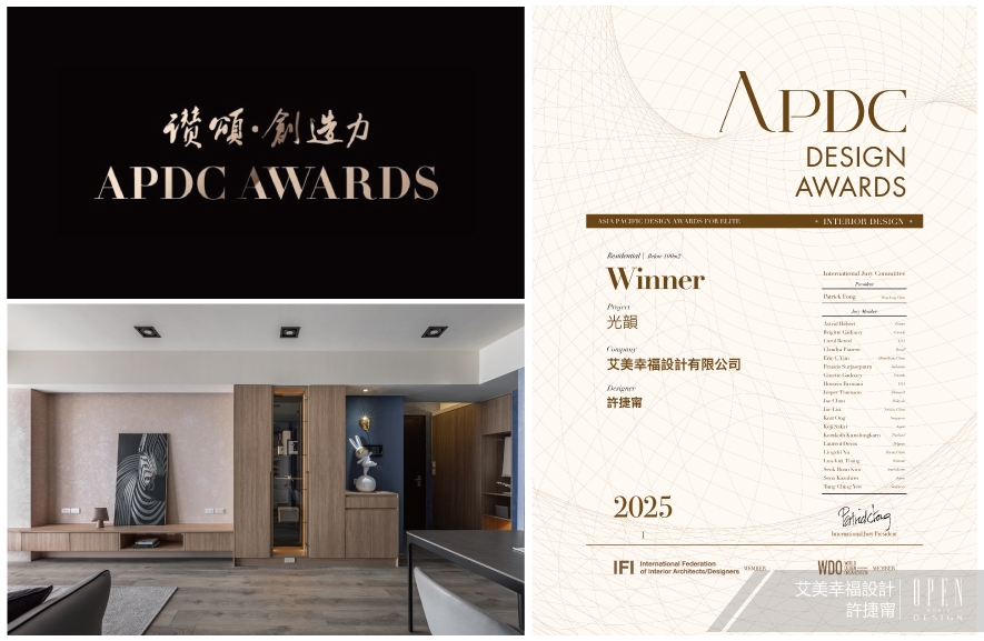 APDC亞太設計中心是室內設計聯合國組織IFI(國際室內建築師設計師團體聯盟)的全球成員,由該組織發起的APDC AWARDS,自2010年起每年舉行一次,今年已來到第16屆,依舊持續秉持「讚頌設計之創造力」的核心,致力將創新的優秀作品推廣至國際舞臺。2025年度賽事中,艾美幸福設計 設計總監 許捷甯 將機長屋主工作中的壯闊視野轉化為居家美學,於客變階段即屏除廚房隔間牆,以木工施作圓潤轉角導引視線,更巧妙延伸沙發背牆深藍跳色包覆至廊道木櫃側面,令小坪數空間展現大氣延展感,成就兼具視覺層次與空間流暢度的天際居所,家宅作品《光韻》以其對生活的細膩詮釋奪得「Winner」榮耀,充分展現團隊深厚的設計底蘊!