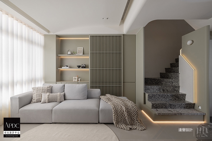 ▲電視牆採用與樓梯踏面相互呼應的紋理鋪陳,透過深色調的沉穩質感、如水墨渲染般的自然過渡,平衡黑白兩色居多的環境色彩,對向沙發背牆以木作格柵與開放層架自然融合,在線性元素的韻律中創造收納與展示的雙重機能,讓生活物件成為空間美學的一部分。