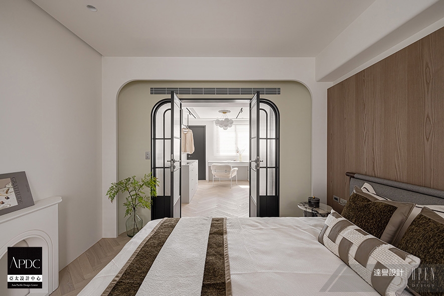 ▲睡眠區及更衣室交界處設置黑色鐵件拱形對開門,並巧妙運用原有門上大樑限制,將吊隱式冷氣出風口整合於樑下,在牆面色彩變化處延續拱形造型的木作設計,框出優美景深層次。