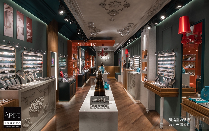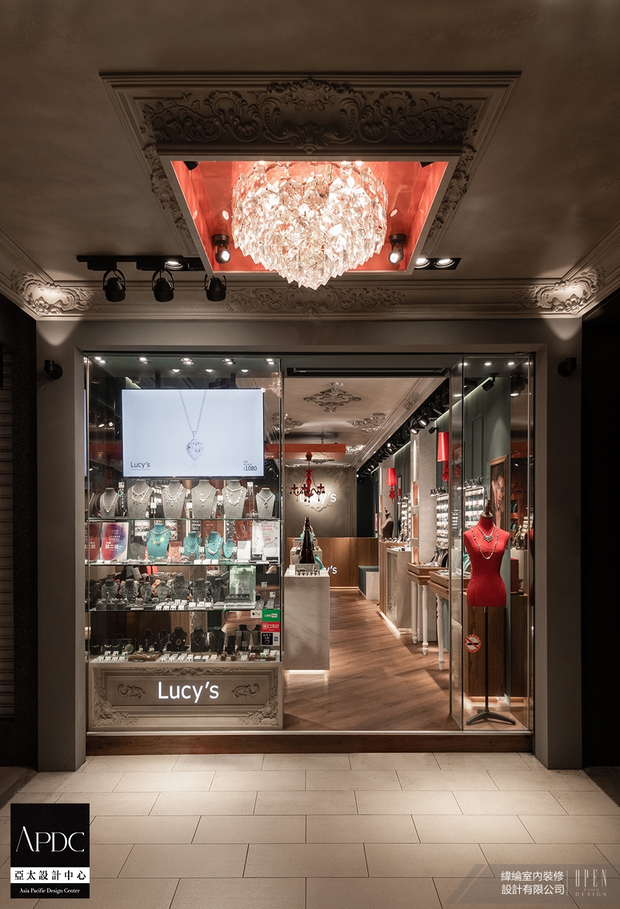 ▲騎樓天花板設計古典雕花與水晶吊燈,將優雅氛圍延伸至商圈街道,成為日夜閃耀的視覺焦點,引導顧客從日常步入精緻情境;櫥窗以大面透明玻璃呈現多種飾品的佩戴效果,加上色彩對比與品牌logo,讓路人感受「精品卻親民」的第一印象,激發進入店內的好奇心與停留意願。