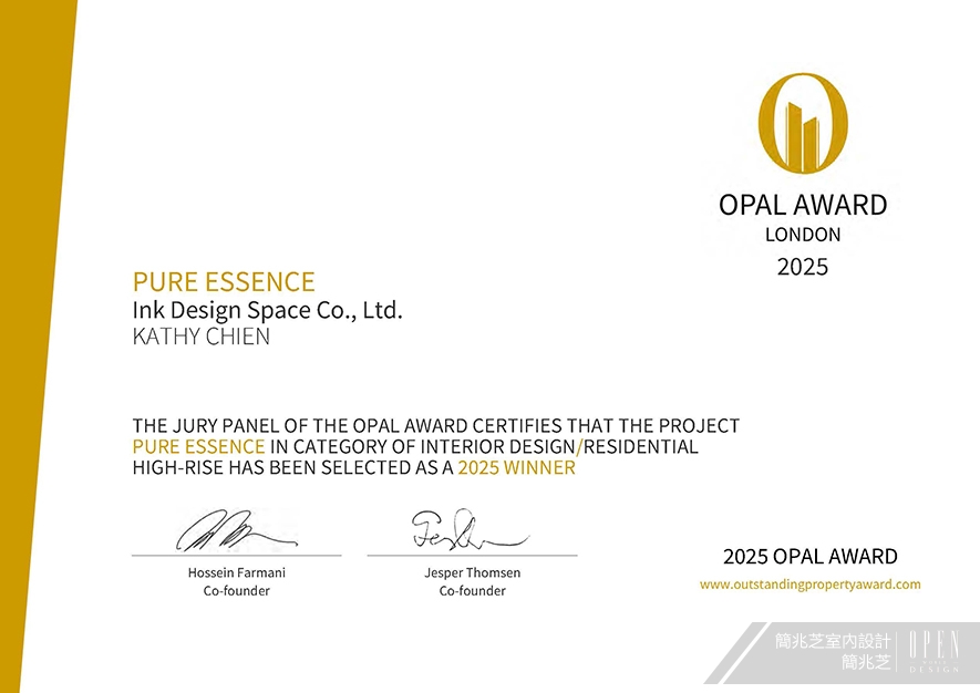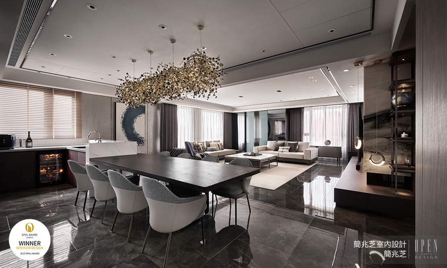OUTSTANDING PROPERTY AWARD LONDON,OPAL(英國倫敦傑出地產大獎)由全球知名企業集團Farmani Group組織,並以招攬全球最佳建築師、室內設計師與房地產開發商為目標,在創造異業菁英聯合平臺的同時,找尋各地最富創造力、革新感、社會影響力與永續性的設計方案。在本屆2025年度賽事中,簡兆芝室內設計 主持設計師 簡兆芝 選擇以住宅《璞玉天成》參與角逐,作品中運用兩戶合併的空間優勢,以灰色基調搭配鍍鈦金屬元素,結合溫潤木質與米白大理石,在繁華都市中築起一片靜謐桃源;其公領域以圓形、半圓形吊燈象徵「圓滿」,回應一家四口對情感交流的渴望;私領域則依據家庭成員個性,透過紋理壁紙與絲絨窗簾,打造專屬於每位居者的精緻場景,成功呼應大賽「找尋創造力、革新感」的宗旨,榮獲「Winner」佳績!