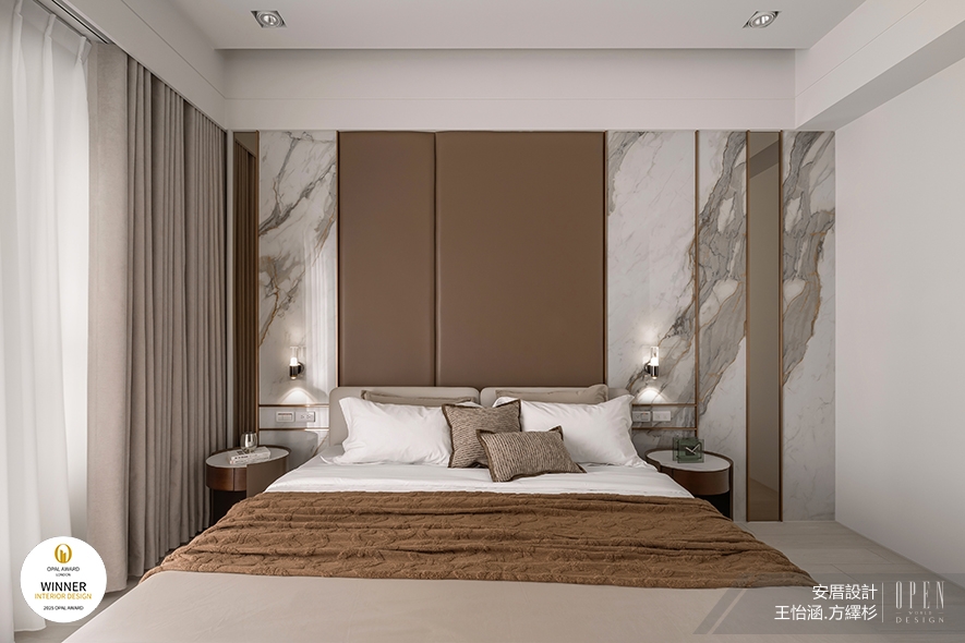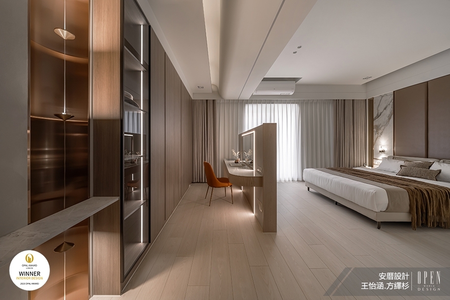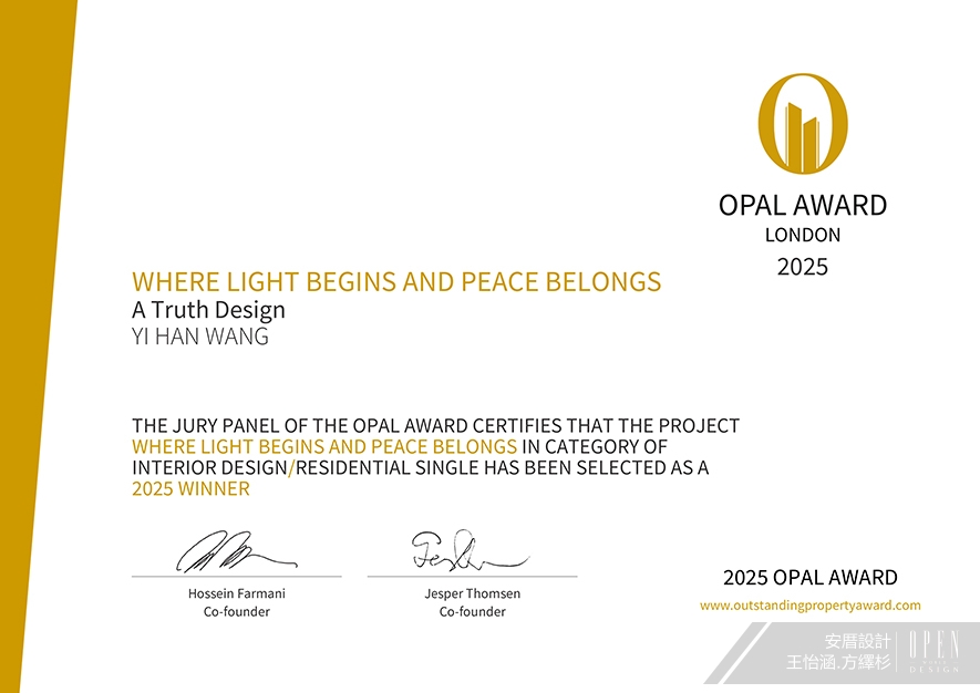 OUTSTANDING PROPERTY AWARD LONDON,OPAL(英國倫敦傑出地產大獎)由全球知名企業集團Farmani Group組織,並以招攬全球最佳建築師、室內設計師與房地產開發商為目標,在創造異業菁英聯合平臺的同時,找尋各地最富創造力、革新感、社會影響力與永續性的設計方案。本屆2025年賽事,安厝設計 主持設計師 王怡涵、設計師 方繹杉 融合華人文化、生活機能以及隱奢美學,於家宅作品《曙燁光宸》中,運用風水概念「背山面海」的吉祥意涵,沙發背牆以藝術塗料及吊燈光影勾勒綿延山勢意象,提供業主心靈層面的依靠感;對側電視牆則拼接海洋般色彩的藍、綠、白玉石,創造開闊放鬆觀感。處處蘊藏祝福寓意的優美生活端景,其富饒深厚新意的設計巧思備受評審團好評,一舉抱回此次「Winner」大獎!