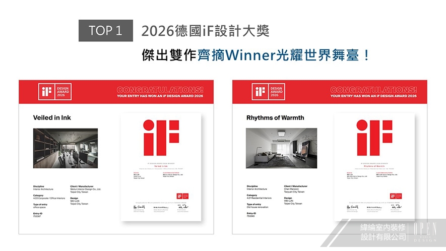 世界四大設計獎之一的德國 iF 設計大獎,在國際間擁有無可取代的指標性及前瞻性。本屆賽事,緯綸團隊精心挑選兩件作品報名參賽,《墨隱》跳脫辦公場所的制式,藉由整室沉靜暗調佐搭木紋、金屬異材,打造細膩精美的工作環境;另一件《暖序》運用匠心奠下的留白,輔以地坪及軟裝的淺灰層次,營造簡約舒心的居家氛圍。兩間精美創作一同贏得此次「Winner」大獎!