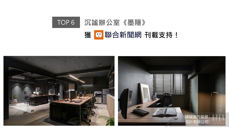 華葦軒總監主導自用辦公室《墨隱》設計,先以天壁、立面的闃黑色調,圍塑靜心和穩的空間基底,其間施作大面肌理多樣的藝術塗料,堆疊精巧細緻的層次美感,傳達品牌對設計細節與氛圍掌控的精熟專業度,滿溢緯綸質感美學的創作,喜獲聯合新聞網刊登推薦!