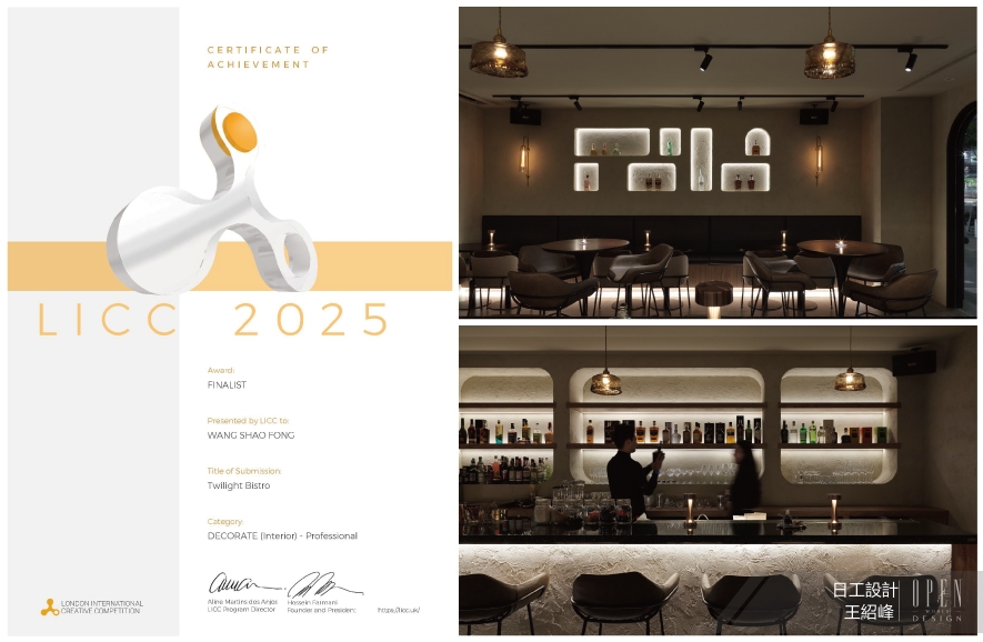 全球指標性設計大獎London International Creative Competition(英國倫敦國際創意大賽,簡稱LICC),於2006年開展至今,每年皆向多國設計好手發出邀請,藉由評選出當中佼佼之作,引領建築、繪畫、影像等11大創作領域齊步向前!日工設計 設計總監 王紹峰 以兩件風格鮮明的商空作品角逐本屆賽事,其中《Groovy Hair Salon》將灰階藝術塗料和溫潤木質揉合於挑高雙層結構,墨綠磁磚櫃臺藉由色彩為動線指引,簡約卻富韻致的沙龍場域兼顧開放明亮及私密舒適,獲選「Shortlist」殊榮;另外《Twilight 餐酒館》則取暮光意象為靈魂,採用奶茶色霧面塗料與手工鑿刻壁面,配合低色溫暖光層次鋪陳,將減法設計推向極致,構築出日夜交界般令人微醺放鬆的沉浸式用餐場景,榮獲「Finalist」亮眼肯定!