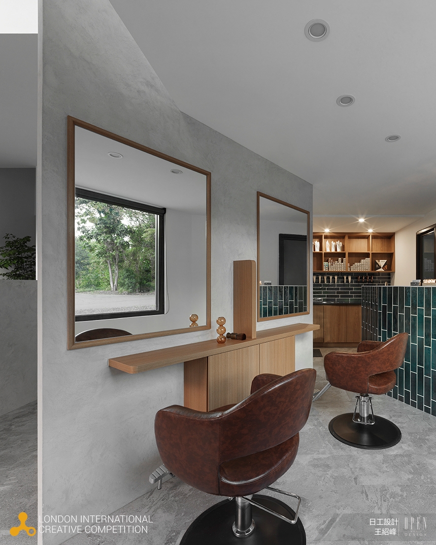 ▲理髮廳標誌性的旋轉燈設置於一樓洗頭區外牆,不僅避免影響外部招牌的視覺設計,更成為室內別具巧思的造型亮點;墨綠色的磁磚櫃檯清晰引導動線外,更呼應後方色彩豐富的商品展示區,吧台同時可遮擋部分員工休息區,維持整體空間的秩序與美感。