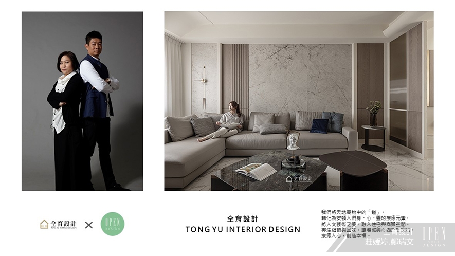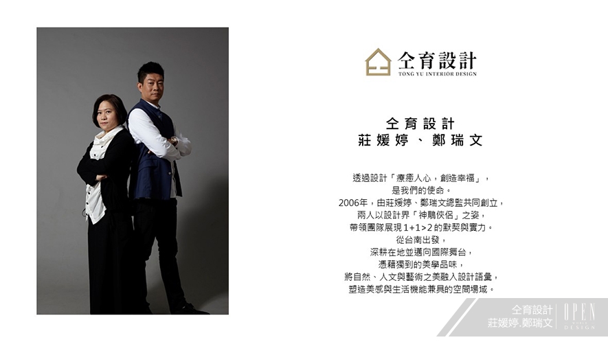 「美,是生活經驗的表達,更是生命態度的細致展現。」仝育設計 設計總監 莊媛婷、創意總監 鄭瑞文 健康正向的身心狀態,正是所有作品皆蘊藏自適氛圍的個中原由;他們細心傾聽每位客戶的各式需求,再透過積累逾三十年的建築設計歷練,精準擘劃出貼合使用者、滿盈美感的質感空間,在顧客綻放滿足的笑容中,無形傳達更多象征仝育美學的療愈幸福感!