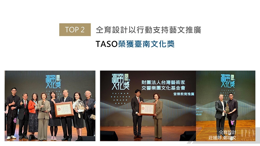 仝育設計長期支持的臺灣藝術家交響樂團文化基金會(TASO),由鄭瑞文總監擔任基金會董事,在基金會眾人的積極努力下,TASO榮獲第十四屆「臺南文化獎」團體獎。獲得這份象征臺南藝文界最高榮譽的獎項,是對TASO多年來深耕音樂的認可,也無疑肯定了仝育的支持已化作藝文推廣的養分,藉由從設計衍伸出的藝術美學,充分傳達生活中的美好樣貌。