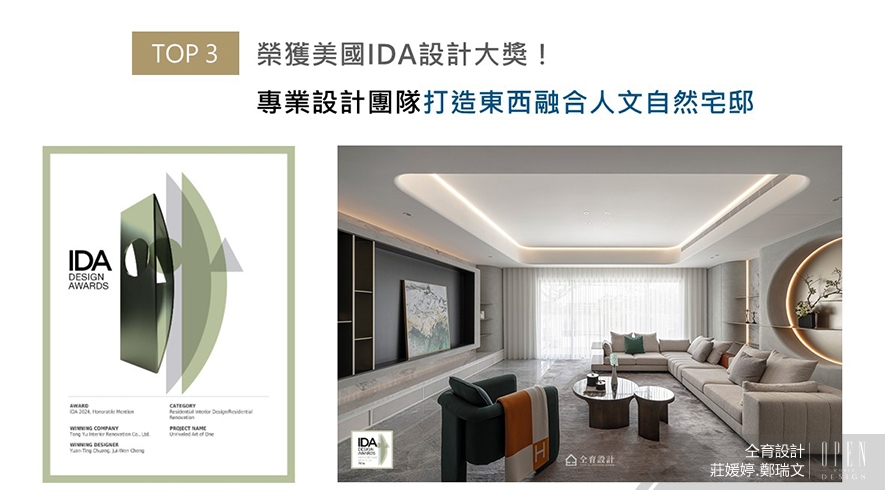 美國IDA國際設計大獎以創新性、實用性和發展性等多種面向為評選標準,旨在表彰「設立新標準」與「突破室內設計界限」、「改變人們生活和工作空間」的優秀設計師及團隊。仝育設計團隊精選作品《是獨一也無二》參賽,藉由東西合璧塑造而成的自然怡情氛圍,賦予住家精致優美的生活質感,另一方面更展現超越賽事「突破設計界限」的嶄新創想,一舉抱回「Honorable Mention」榮譽!