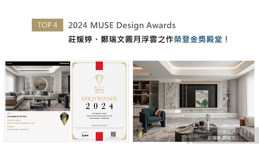MUSE Design Awards由歷史悠久的國際獎項協會IAA主辦,以發掘全球設計繆思為宗旨,其著重於設計精致程度與作品完成度及深度的嚴格評分標準,吸引國際知名品牌與設計師爭相參與。本次,莊媛婷與鄭瑞文總監藉由巧妙揉入古典詩意與西方裝潢的家居規劃,搭配完善三代家庭青銀共居需求的機能安排,作品《是獨一也無二》以兼顧空間細致美學和生活實用性的出色設計,斬獲「金獎」榮耀!