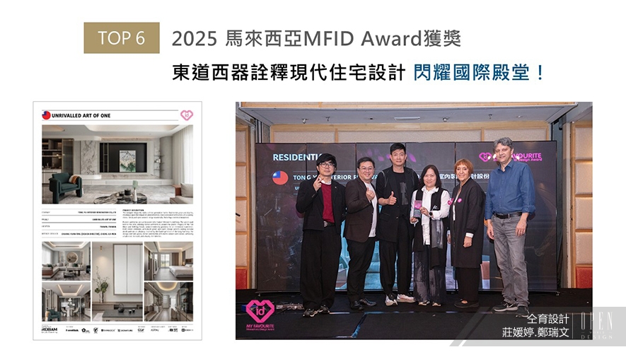 MFID作為馬來西亞首個且唯一的國際設計獎項,在「創新、永續發展與文化交融」的指引下,評選標準含括設計理念、美學表現力、功能性、永續實踐、文化脈絡等五大項目。面對嚴格的審核內容,仝育作品《是獨一也無二》內師法道家「陰陽調和」,藉多樣異材的亮面與霧面質感,呈現對比鮮明的獨特美感,又於屋中劃設分明的樓層動線及區域機能,切實滿足所有居者的生活需求;處處貼合五大評審核心的傑出創作,獲本屆賽事住宅空間類「Winner」殊榮!