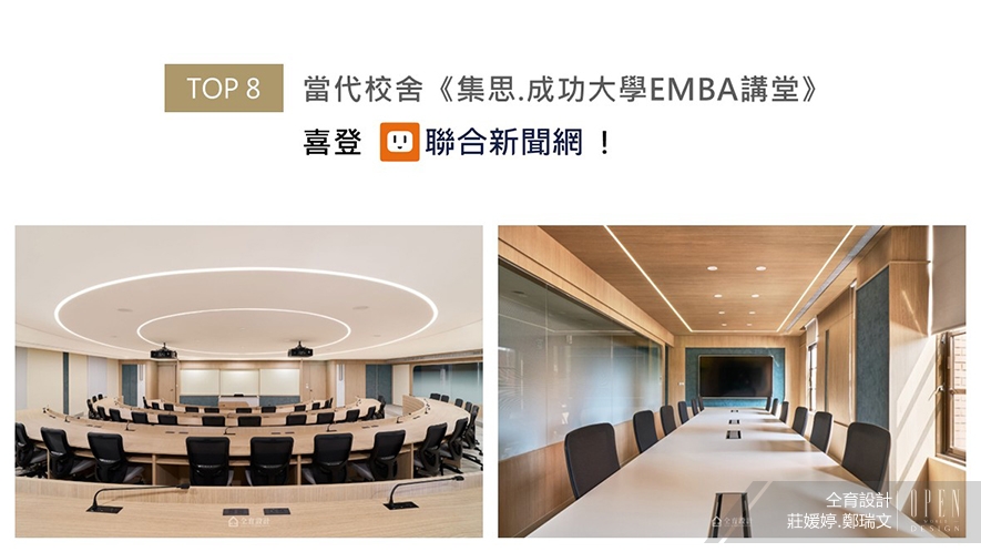 仝育設計團隊為教室《集思.成功大學EMBA講堂》的翻新工程,定下「環境共生,啟發學習」的設計主軸,融合校園歷史底蘊與現代教學需求,重塑明亮優雅的學習場域。整體引入窗外綠蔭光影,搭配內部木質與米白基調,且活用藍綠色藝術塗料點綴壁面,形塑清新舒適的氛圍;煥然一新的舒心當代講堂,獲刊於聯合新聞網版面!
