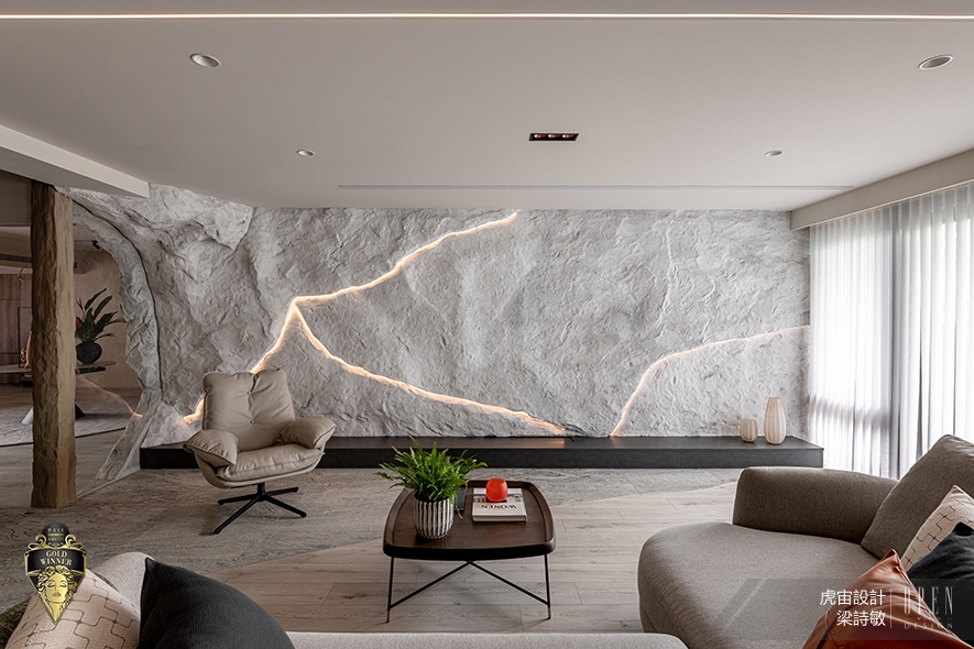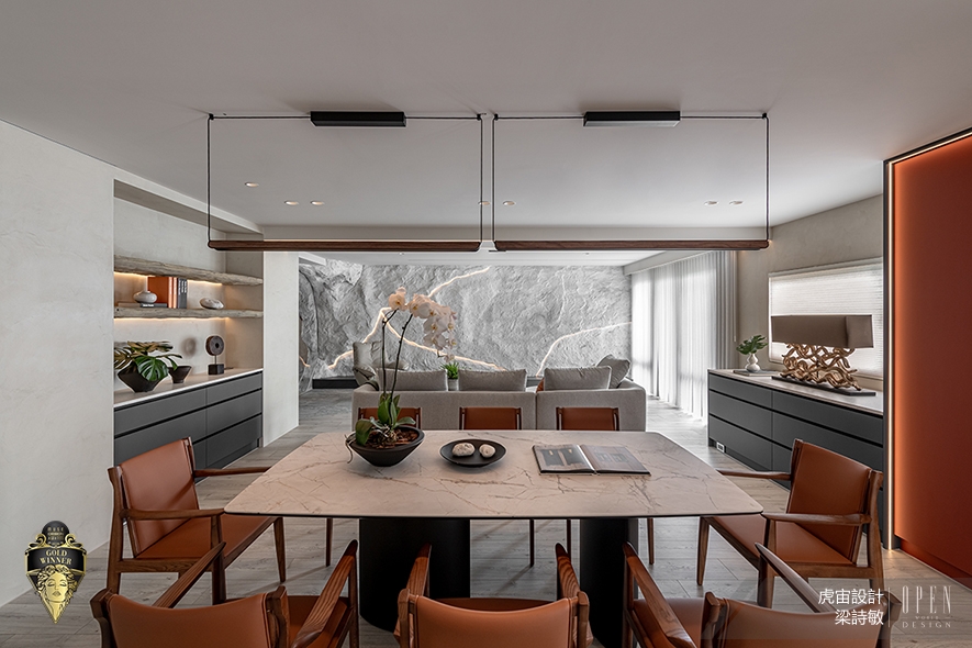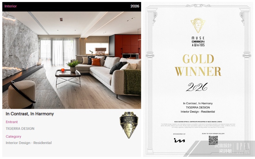 美國MUSE Design Awards致力於發掘全球設計繆思,涵蓋建築、室內、時尚等領域。2026年共吸引來自124國、超過十萬件作品參賽,由200多位專業評審嚴格遴選,為國際設計界的重要指標。虎宙設計 設計總監 梁詩敏 深入探究屋主二人的喜好特質,藉由雙客廳的格局設計,規劃一處飄蘊樸實禪意、一處鮮明吸睛的迥異公領域,分別回應男女主人對沉心自然、創新藝術的品味追求,同時於機能層面滿足各自的商業會談與社交茶敘需求;複合型住宅《岩境‧橙曦》不僅貼合居者們的生活習慣,亦對應本賽事講究的「創意巧思及創作深度」核心,順利斬獲「金獎」出色佳績!