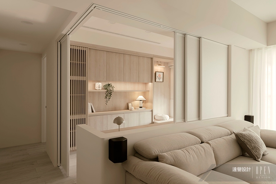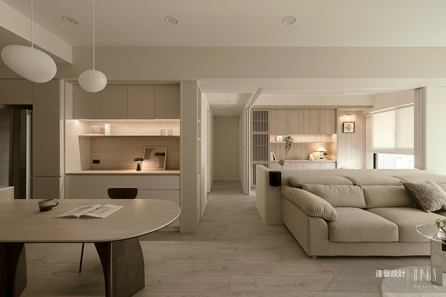 達譽設計團隊 為盡室奶油色交織樸暖木紋,其潛藏的發想已然跳脫「設計」概念,而是讓暖色底蘊轉作日常中的美化濾鏡,柔潤每日遇到的銳角尖刺;人造燈照及自然光線的微光流映間,僅是身處此處,便能徹底療癒倦意,將身心安放在這片承載時間流動和情感匯集的溫柔場域,把生活調節為安定踏實、專屬居者的自在步調。