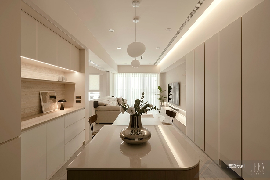 途經玄關廊道、側身轉入公區,奶油世界明快地漸次開展。餐廳作為入門後首個迎賓場域,串聯公領域他處的開放式設計,帶來豁然開朗的空間放大感;上空懸掛兩盞外型圓潤、同時帶點不規則俏皮感的潔白吊燈,捎來一抹引人撇起嘴角的活潑趣味,搭配桌面為淺調圓角石紋、下方則採深木桌腳的中島餐桌,既以下沉上輕的色彩豐富觀感層次,又彷彿繪出一幅雲朵飄過天然島嶼的優美畫作,打造獨樹一幟的怡情用餐光景。