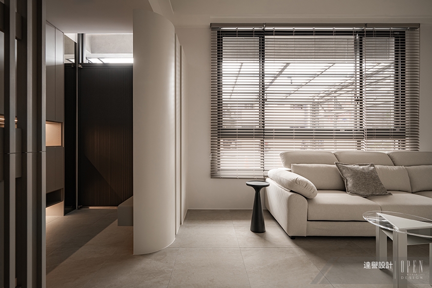 推開門扉,整面暖灰櫃體藉由俐落線條安靜佇立,轉身步入客廳,輕淺色調的白隨即舒展開來,牆面循著一道柔緩曲線化解直角生硬,一旁淺色格柵隔屏輕盈地界定廊道進退,在連貫中悄悄梳理動線鬆緊。靠窗一隅,奶油色沙發被窗外引入的日照輕擁,透明茶几映著窗外樹影,前方電視櫃沿弧牆水平鋪展,機能退居幕後,留出大片空白任光影自在描畫,拼寫安靜卻有溫度的每一天。