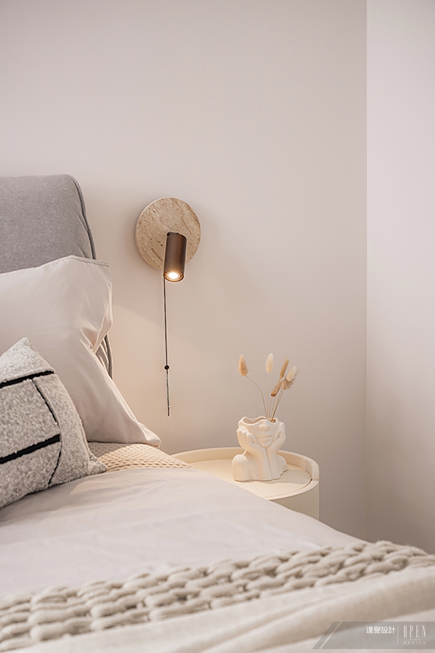 延續全室的淡雅氣質,臥房以灰調布質床頭靠背帶入一絲沉靜的色彩溫差,布藝軟包結合石材底座,既是觸感的溫柔起點,也悄悄為床頭立面勾勒出從容輪廓。床側一盞石材底座的拉繩壁燈,投射出一束收斂而親密的暖光,恰好落在床頭櫃一方小小角落,構成入睡前最後凝視的溫柔靜物。